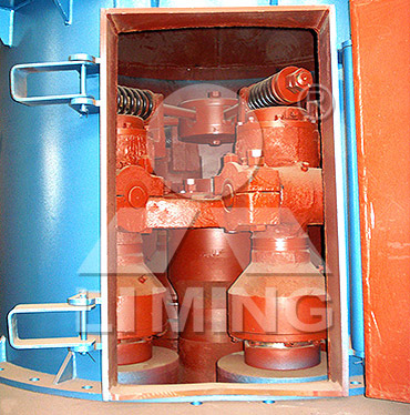 工作時(shí),將需要粉碎的物料從機(jī)罩殼側(cè)面的進(jìn)料斗加入機(jī)內(nèi),依靠懸掛在主機(jī)梅花架上的磨輥裝置,繞著垂直軸線公轉(zhuǎn),同時(shí)本身自轉(zhuǎn),由于旋轉(zhuǎn)時(shí)離心力的作用,磨輥向外擺動(dòng),緊壓于磨環(huán),使鏟刀鏟起物料送到磨輥與磨環(huán)之間,因磨輥的滾動(dòng)碾壓而達(dá)到粉碎物料的目的。