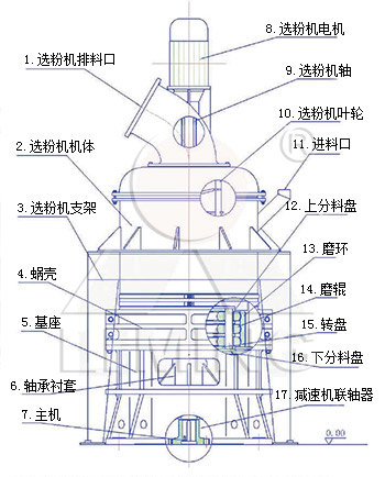 主機電動機通過減速機帶動主軸及各層轉盤旋轉,轉盤通過柱銷帶動幾十個環(huán)輥在磨環(huán)滾道內滾動并旋轉。大塊物料經(jīng)破碎機破碎成小顆粒后由提升機送入儲料倉,電磁振動給料機將物料均勻的送到上轉盤的中部,物料在離心力的作用下散向圓周邊,并落入磨環(huán)的滾道內被環(huán)輥沖壓、滾碾、研磨而粉碎,物料經(jīng)第一層粉碎后又落入第二層及第三層,高壓離心風機的抽吸作用將外部空氣吸入機內,并將經(jīng)過第三層粉碎后的粗粉帶入選粉機內。選粉機內旋轉的蝸輪所產(chǎn)生的蝸流使粗顆粒物料回落重磨,細粉則隨氣流進入旋風集粉器并由其下部的卸料閥排出即為成品,而帶有少量細粉塵的氣流則經(jīng)過脈沖除塵器凈化后通過風機及消聲器排出。